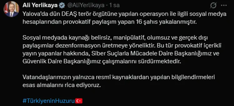 ANKARA (İGFA) - İçişleri Bakanı Ali Yerlikaya, Yalova’da dün DEAŞ terör örgütüne yönelik gerçekleştirilen operasyonun ardından sosyal medyada provokatif ve manipülatif içerik paylaşan 16 kişinin yakalandığını duyurdu.