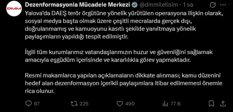 Öte yandan Dezenformasyonla Mücadele Merkezi (DMM) de yazılı bir açıklama yaparak, Yalova’daki operasyonla ilgili sosyal medya başta olmak üzere çeşitli mecralarda gerçek dışı ve doğrulanmamış paylaşımlar yapıldığını bildirdi. Açıklamada, vatandaşların resmî makamların açıklamalarını dikkate alması ve kamu düzenini hedef alan dezenformasyon içeriklerine itibar etmemesi gerektiği vurgulandı.
