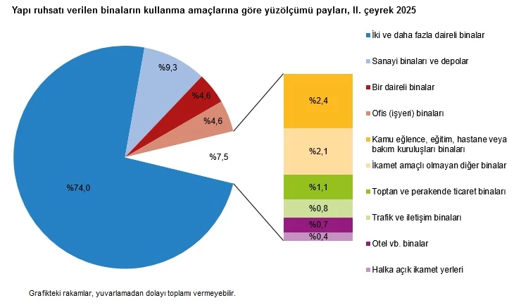 Yapı kullanma izin belgelerinde de artış gözlendi. 2025 II. çeyreğinde, bir önceki yıla göre bina sayısı yüzde 18,1, daire sayısı yüzde 44,3 ve yüzölçüm yüzde 30,2 arttı. Toplam yüzölçümün yüzde 85,5’i belediyeler, yüzde 14,5’i diğer idareler tarafından verildi. İki ve daha fazla daireli ikamet amaçlı binalar 18,4 milyon m² ile lider olurken, sanayi binaları ve depolar 3,5 milyon metrekare ile takip etti.