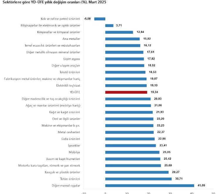 Verilere göre, Yurt Dışı Üretici Fiyat Endeksi (YD-ÜFE), Mart 2025’te yıllık yüzde 19,34, aylık yüzde 4,06 artış gösterdi. Endeks, bir önceki yılın Aralık ayına göre yüzde 8,32, 12 aylık ortalamalara göre ise yüzde 31,43 yükseldi.
