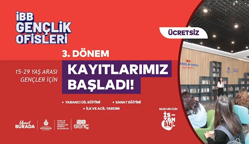 İstanbul Büyükşehir Belediyesi (İBB) tarafından 15-29 yaş arası gençlerin eğitim, kişisel gelişim ve kariyerlerini desteklemek amacıyla düzenlenen kurs ve seminerlerin gerçekleştirildiği İBB Gençlik Ofislerinde, 2025 yılı üçüncü dönem başvuruları başladı. Haftanın yedi günü hizmet veren Gençlik Ofislerinde üçüncü dönem eğitim programları 29 Eylül’de başlayacak. Ücretsiz olarak sunulan eğitimler, ekim, kasım ve aralık aylarını kapsayacak. 28 Aralık’ta tamamlanacak programlar, hem öğrenim hayatına devam eden hem de iş hayatına adım atmaya hazırlanan gençler için tasarlandı.