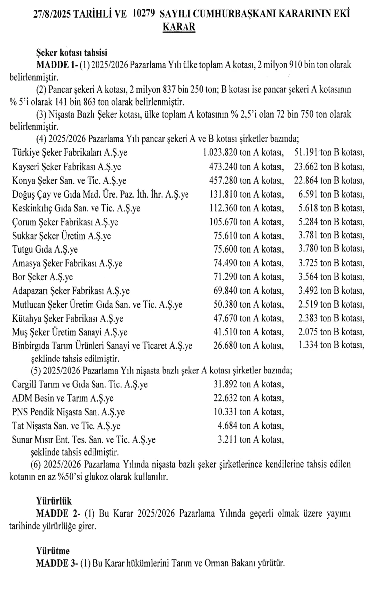 Ayrıca, pancar şekeri A ve B kotaları ile nişasta bazlı şeker A kotası miktarları şirketler bazında detaylandırıldı. Nişasta bazlı şeker şirketlerinin, tahsis edilen kotanın en az yüzde 50’sini glukoz olarak kullanacağı belirtildi.