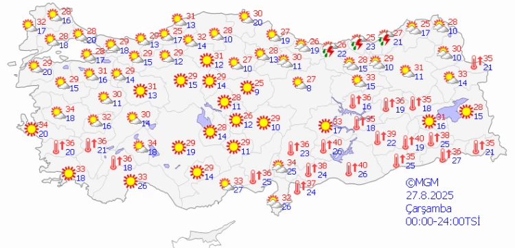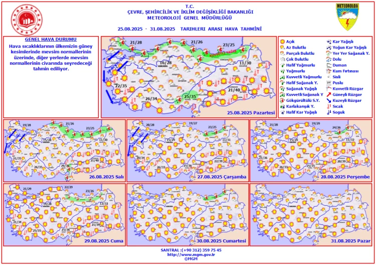 Meteoroloji Genel Müdürlüğü, 25-31 Ağustos 2025 haftası için hava durumu tahminini açıkladı. Ülkenin güney kesimlerinde sıcaklıklar mevsim normallerinin üzerinde seyrederken, diğer bölgelerde normaller civarında olacak.