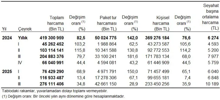 TÜİK verilerine göre yurt içi seyahat harcamaları, bir önceki yılın aynı çeyreğine kıyasla yüzde 34,8 arttı. Harcamaların yüzde 84,5’i kişisel harcamalardan, yüzde 15,5’i ise paket tur harcamalarından oluştu. Seyahat başına ortalama harcama 10 bin 189 TL olarak kaydedildi.