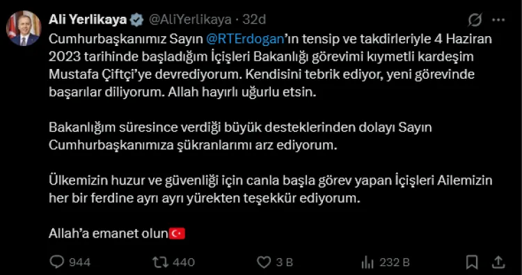 Cumhurbaşkanı Erdoğan imzasıyla Resmi Gazete'de yayımlanan atama kararıyla İçişleri Bakanlığı görevini Mustafa Çiftçi’ye devredecek olan Ali Yerlikaya, paylaşımında Cumhurbaşkanı Recep Tayyip Erdoğan’ın tensipleriyle 4 Haziran 2023’te başladığı görevini devrettiğini belirterek, “Kıymetli kardeşim Mustafa Çiftçi’yi tebrik ediyor, yeni görevinde başarılar diliyorum” ifadelerini kullandı. Yerlikaya, görev süresi boyunca verdiği desteklerden dolayı Cumhurbaşkanı Erdoğan’a teşekkür ederken, İçişleri Bakanlığı teşkilatının tüm mensuplarına da şükranlarını sundu.