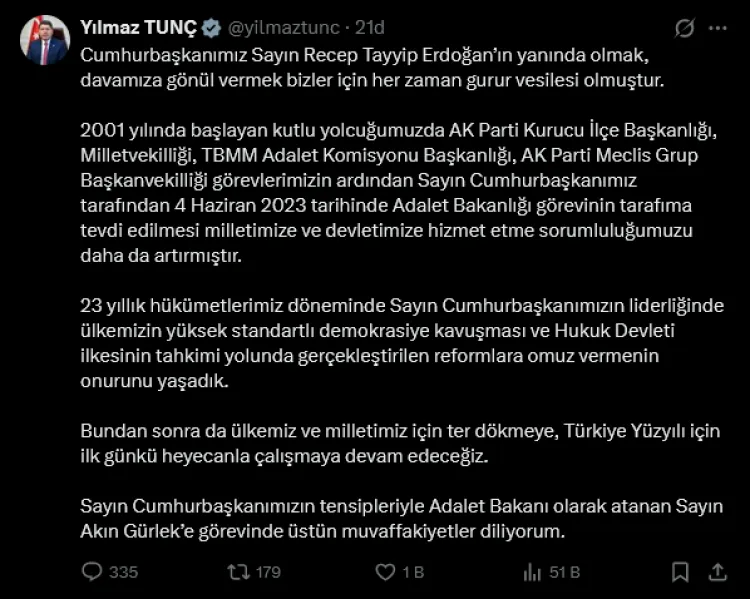 Yine Resmi Gazete'deki aynı kararname ile Adalet Bakanlığı görevinden ayrılan Yılmaz Tunç ise açıklamasında, Cumhurbaşkanı Erdoğan’la yürütülen siyasi mücadelenin kendileri için her zaman bir gurur kaynağı olduğunu vurguladı. AK Parti’de üstlendiği çeşitli görevlerin ardından 4 Haziran 2023’te Adalet Bakanlığı görevine getirildiğini hatırlatan Tunç, bu süreci millet ve devlet hizmeti açısından büyük bir sorumluluk olarak gördüğünü ifade etti.