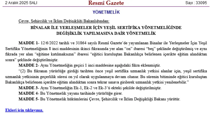Çevre, Şehircilik ve İklim Değişikliği Bakanlığı, binalar ve yerleşmeler için verilen yeşil sertifika uygulamalarında önemli değişiklikler yaptı. Resmî Gazete’de yayımlanan yeni yönetmelik ile uzmanlık yetkisi süresi ve eğitim şartları güncellendi.