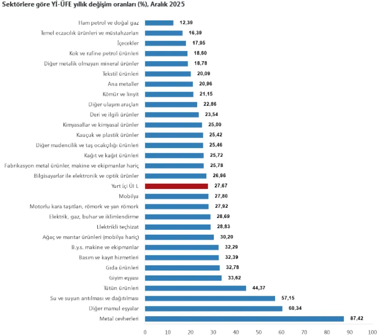 Türkiye İstatistik Kurumu’nun (TÜİK) açıkladığı Aralık 2025 verilerine göre Yurt İçi Üretici Fiyat Endeksi (Yİ-ÜFE), aylık bazda yüzde 0,75, yıllık bazda ise yüzde 27,67 artış gösterdi. Yıllık bazda en yüksek artış yüzde 57,15 ile su temininde kaydedildi.