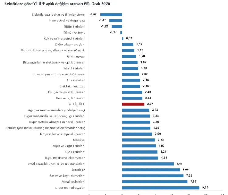 ANKARA (İGFA) - Türkiye İstatistik Kurumu (TÜİK), 2026 yılı Ocak ayı Yİ-ÜFE verilerini açıkladı. Buna göre, endeks bir önceki aya ve bir önceki yılın Aralık ayına göre yüzde 2,67 artarken, on iki aylık ortalamalara göre artış yüzde 25,39 oldu.
