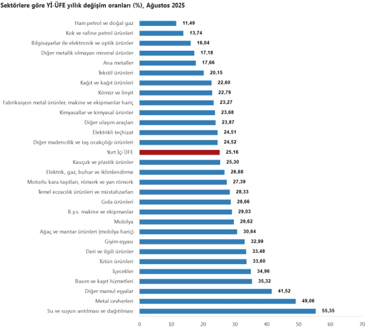 TÜİK, 2025 Ağustos ayı Yurt İçi Üretici Fiyat Endeksi (Yİ-ÜFE) verilerini yayımladı. Yİ-ÜFE’de yıllık yüzde 25,16, aylık yüzde 2,48 artış kaydedilirken en yüksek artış su temininde (yüzde 55,35), en dikkat çekici aylık yükseliş ise elektrik ve gazda (yüzde 10,09) görüldü.
