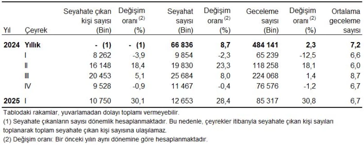 Seyahat sayısı, geçen yılın aynı dönemine göre yüzde 28,4 artarak 12 milyon 653 bine ulaştı. Seyahat edenler, toplam 85 milyon 317 bin geceleme yaptı, ortalama geceleme süresi ise 6,7 gece olarak kaydedildi.