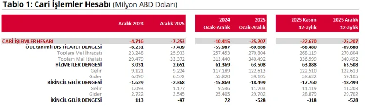 Türkiye Cumhuriyet Merkez Bankası verilerine göre Aralık 2025’te cari işlemler hesabı 7 milyar 253 milyon dolar açık verdi. Yıllıklandırılmış cari açık ise 25,2 milyar dolar olarak gerçekleşti.