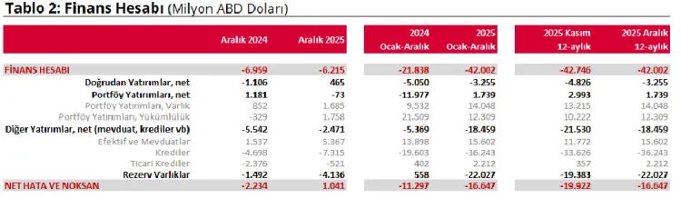 2025 yılı Aralık ayı itibarıyla yıllıklandırılmış cari açığın finansmanında; net doğrudan yatırımlar 3,3 milyar dolar katkı, krediler ise 36,2 milyar dolar katkı sağlandı.