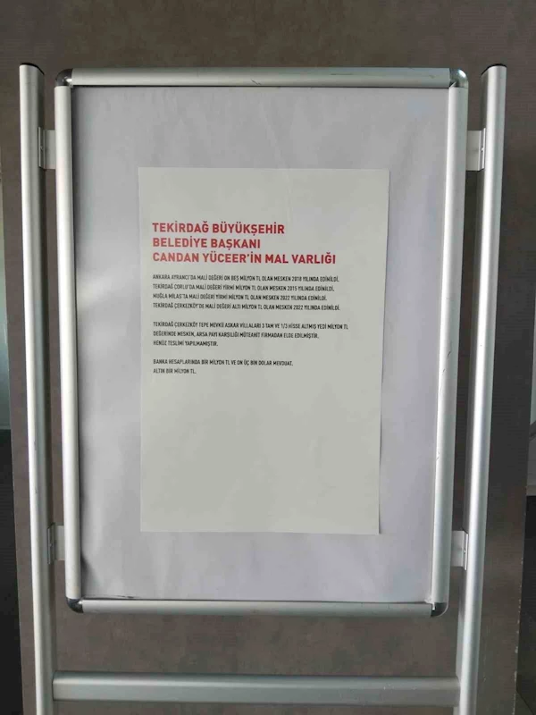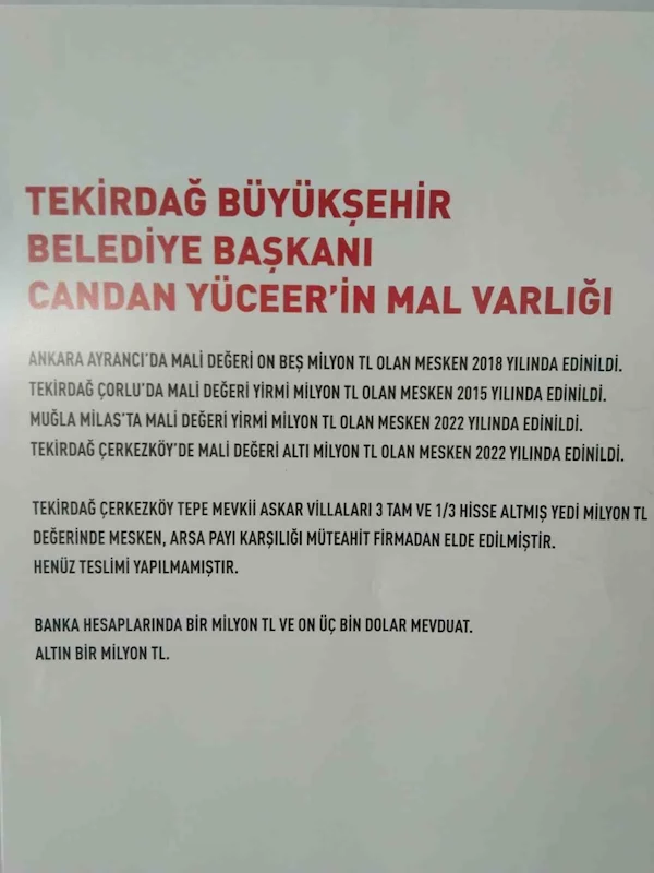31 Mart 2024 tarihinde gerçekleştirilen mahalli idareler seçiminde Tekirdağ Büyükşehir Belediye Başkanı seçilen Dr. Candan Yüceer, mal varlığını belediyedeki panolara astı.