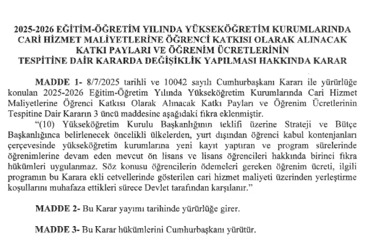 ANKARA (İGFA) - Cumhurbaşkanlığı, 8 Temmuz 2025 tarihli ve 10042 sayılı Karar’da (9 Temmuz 2025 Resmi Gazete) yapılan değişiklikle, yükseköğretim kurumlarında öğrenci katkı payı ve öğrenim ücretlerini güncelledi.