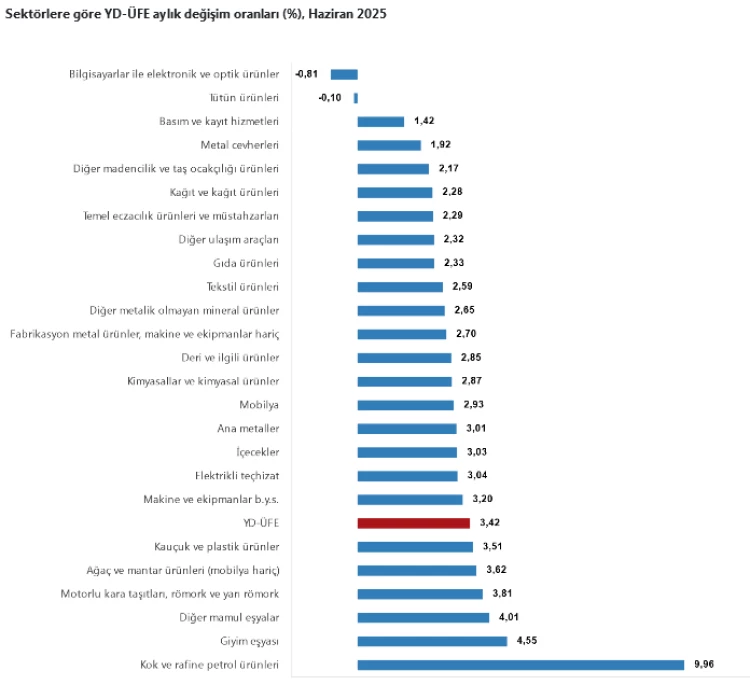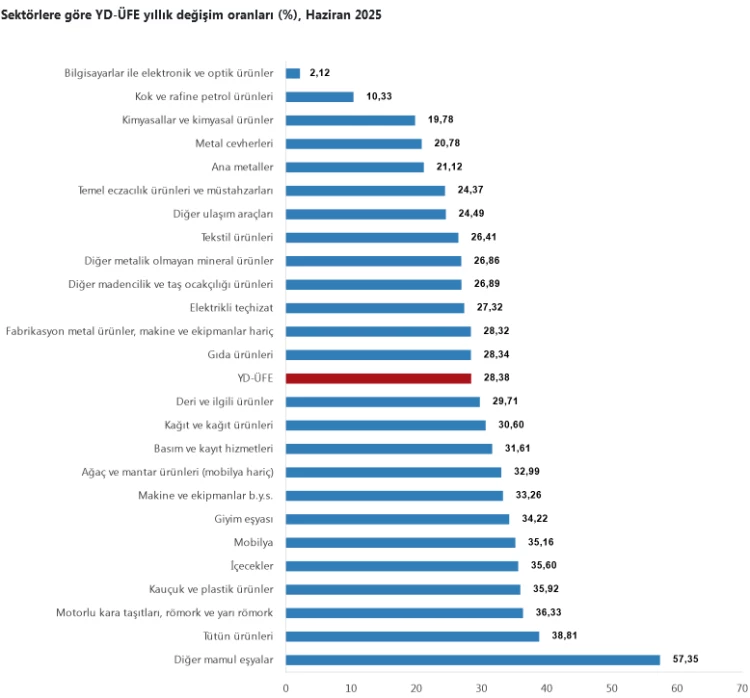 TÜİK verilerine göre, Yurt Dışı Üretici Fiyat Endeksi (YD-ÜFE) Haziran 2025’te aylık yüzde 3,42, yıllık yüzde 28,38 artış gösterdi. İmalat sektöründe yıllık artış yüzde 28,48 oldu.