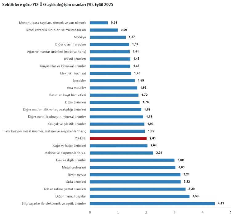 TÜİK Eylül 2025 YD-ÜFE verilerine göre, yıllık yüzde 27.71, aylık yüzde 2.01 arttı. İmalat yüzde 27.72, madencilik yüzde 27.06 yükseldi; enerji grubu aylık yüzde 3.39 artışla lider. Dayanıksız tüketim malları yüzde 33.45 artış gösterdi.