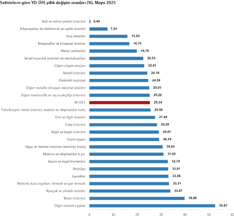 Türkiye İstatistik Kurumu’nun (TÜİK) verilerine göre, Yurt Dışı Üretici Fiyat Endeksi (YD-ÜFE) Mayıs 2025’te bir önceki aya göre yüzde 2,40, bir önceki yılın aynı ayına göre yüzde 25,34 yükseldi. İmalat sektöründe yıllık artış yüzde 25,40, aylık artış ise yüzde 2,36 oldu.