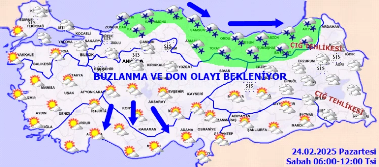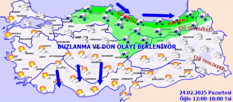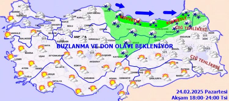 Meteorolojik uyarılara göre de; kuzey, iç ve doğu kesimlerde kuvvetli olmak üzere Türkiye genelinde buzlanma ve don ile sis ve pus olayı bekleniyor.