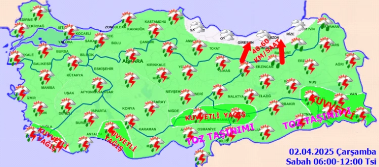 Yurt genelinde hava bugün parçalı ve çok bulutlu olup, aralıklı sağanak ve gök gürültülü sağanak yağışlı geçmesi bekleniyor. Doğu Akdeniz, Güneydoğu Anadolu ile Doğu Anadolu’nun güneydoğusunda toz taşınımı beklendiğinden hava kalitesinde azalma, çamur şeklinde yağış gibi yaşanabilecek olumsuzluklara karşı vatandaşlar uyarıldı.