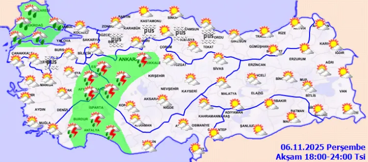 ANKARA (İGFA) - Meteoroloji Genel Müdürlüğü’nün değerlendirmelerine göre; Marmara’nın batısı, İç Ege, Batı Akdeniz, İç Anadolu’nun batısı ile Bursa, Kocaeli, Aydın, Muğla, Aksaray, Kırıkkale ve Kırşehir çevrelerinde aralıklı sağanak ve gök gürültülü sağanak yağış bekleniyor.