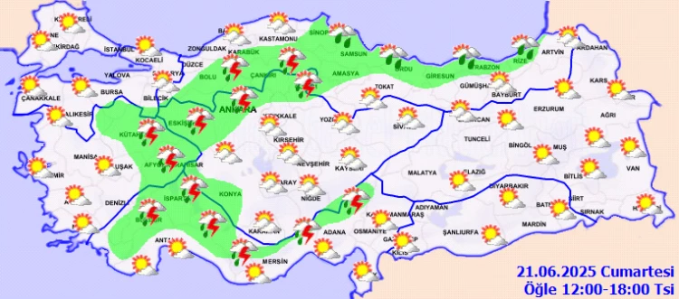 ANKARA (İGFA) - Meteoroloji Genel Müdürlüğü tarafından yapılan tahminlere göre: Ülkemizin kuzey ve iç kesimlerinin parçalı, yer yer çok bulutlu, Marmara’nın güneydoğusu, Göller yöresi, Akdeniz'in Toroslar mevkii, Batı Karadeniz’in iç kesimleri, Orta Karadeniz (Tokat hariç), Doğu Karadeniz kıyıları ile Kütahya, Afyonkarahisar, Ankara, Çankırı, Eskişehir, Konya ve Sinop çevrelerinin yerel olmak üzere sağanak ve gök gürültülü sağanak yağışlı, diğer yerlerin az bulutlu ve açık geçeceği tahmin ediliyor. Rüzgarın Marmara, Kuzey Ege ve İç Anadolu’nun kuzeyinde, kuzeyli yönlerden kuvvetli (40-60km/saat) olarak esmesi bekleniyor.