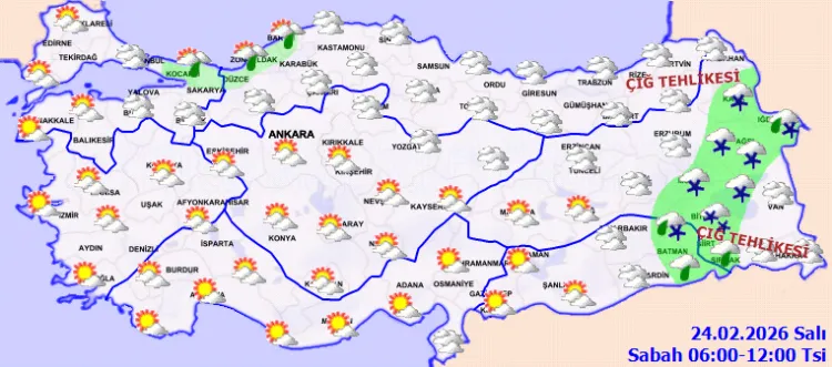 ANKARA (İGFA) - Meteoroloji, 24 Şubat Salı gününe ilişkin hava tahmin raporunu yayımladı. Yapılan son değerlendirmelerine göre Türkiye genelinde parçalı ve yer yer çok bulutlu bir hava hakim olacak. Marmara, Kuzey Ege, İç Anadolu’nun kuzeyi, Batı Karadeniz ile Doğu Anadolu’nun doğusu ve Çorum, Amasya, Batman ile Siirt çevrelerinde yağış bekleniyor.