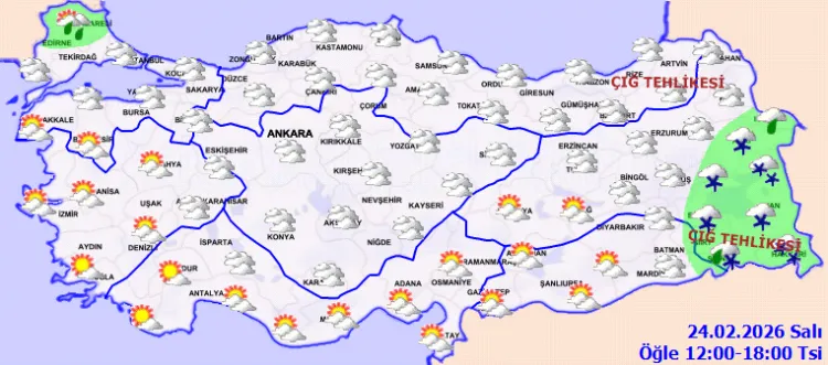 Meteoroloji Genel Müdürlüğü verilerine göre yurdun büyük bölümünde yağış beklenirken, Doğu Karadeniz ve Doğu Anadolu’da çığ ve kar erimesi tehlikesine karşı uyarı yapıldı. Hava sıcaklıkları ise mevsim normallerinin üzerinde seyredecek.