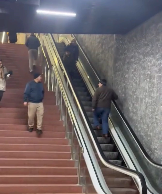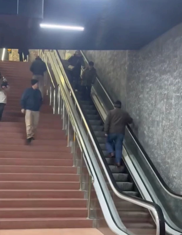 Bursa’da bir vatandaş, metrodan indikten sonra yukarı çıkmak için yürüyen merdivene ters bindi. Israrla ters ilerlemeye çalışan kişi, çevredekilerin şaşkın bakışları sonrası tekrar aşağı indi. O anlar kameraya yansıdı.