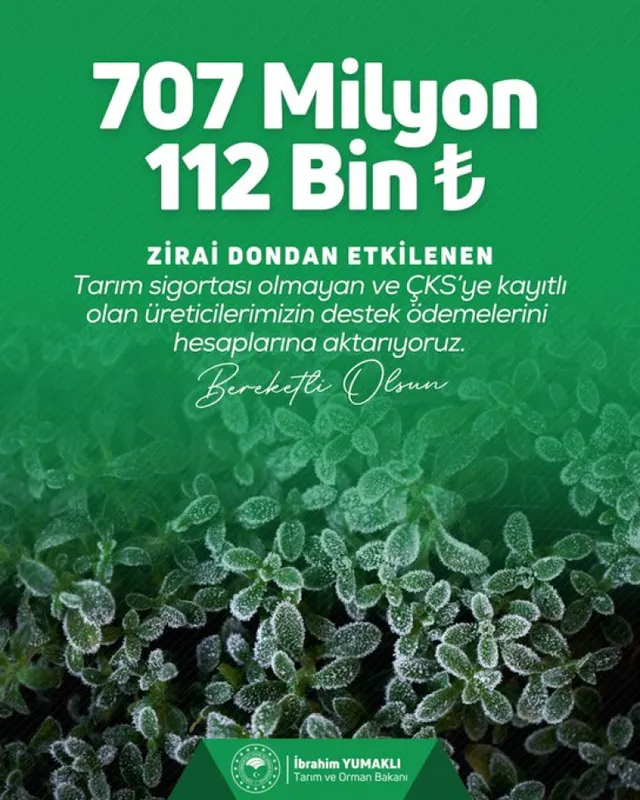 ANKARA (İGFA) - Tarım ve Orman Bakanı İbrahim Yumaklı, zirai dondan zarar gören üreticilere yapılan destek ödemelerine ilişkin yeni bir açıklama yaptı.